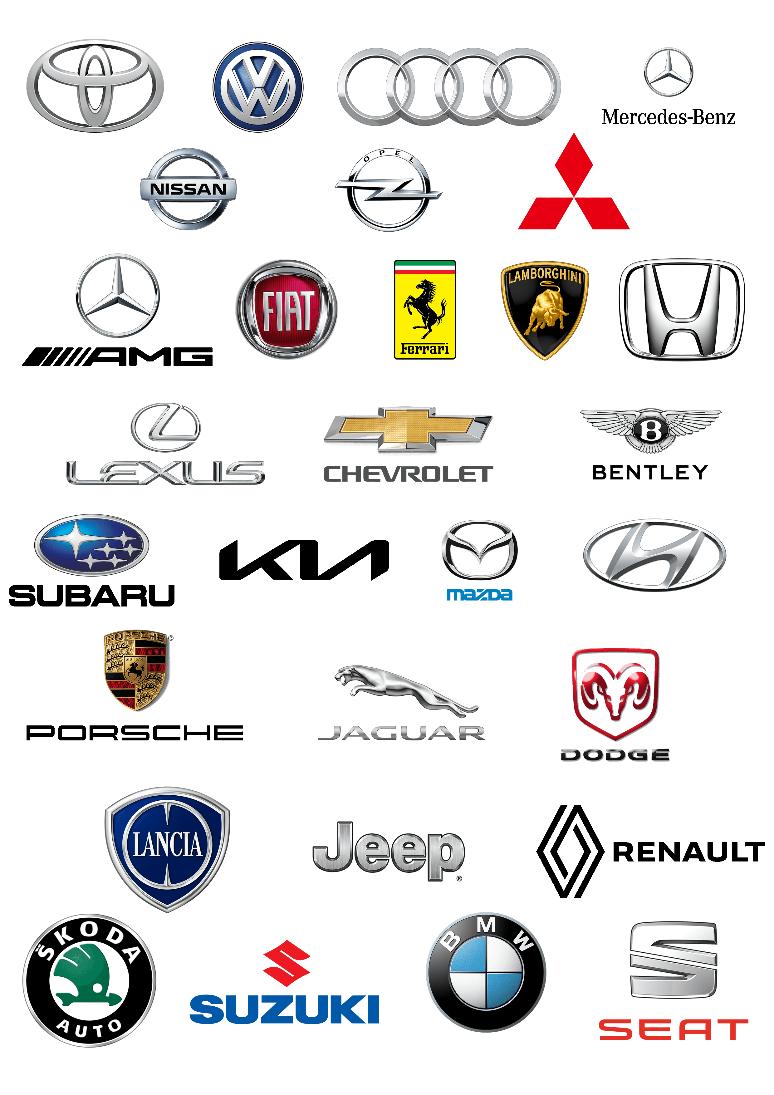 Audi, BMW, Mercedes-Benz, VW, Opel, Ford, Toyota, Peugeot, Renault, Citroën, Fiat, Hyundai, Kia, Mazda, Nissan, Honda, Skoda, Seat, Volvo, Suzuki, Mitsubishi, Dacia, Tesla u.v.m.